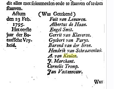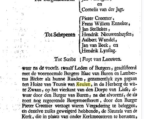 In 1795 wordt het nieuwe bestuur van de gemeente bepaald in Lisse (Bataafse vrijheid na bezetting door Napoleon). Anthony (Teunis) van Keulen is een van de ondertekenaars, ook vindt de ondertekening plaats in zijn herberg. (zoek in google boeken op: "teunis van keulen")