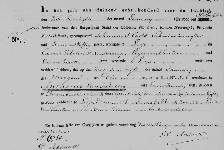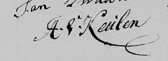 Bij den mutuelen testamente van wijlen mjn vader en moeder op den 10 july 1772 voor den notaris Willem Jacobus Sennepart en getuijgen Alhier te Lisse gepassseert door ondergeteekende gemaakt en de besproken zijnde een gelijk regt met mijne broeder Anthony van Keulen, Op de herberg de Witte Zwaan cum annexis Alhier te Lisse Staande ende geleegen hebbe ik ondergeteekende uijt bysonderen consideratie voor mijnen opgemelde broeder en de ten behoeve en in faveure van hem Wel Willen Desisteren, van voorgemelde Keuze of regt aan mij bij bovengemelde dispositie testamentair besproken. Zo als ik ben Doende bij ... ten Welken zijnde en op dat daar van ten elken tijde zonder kunnen blijken Doende met mijne naamteeckening bekragtid hebben in Lisse den 8 December 1786